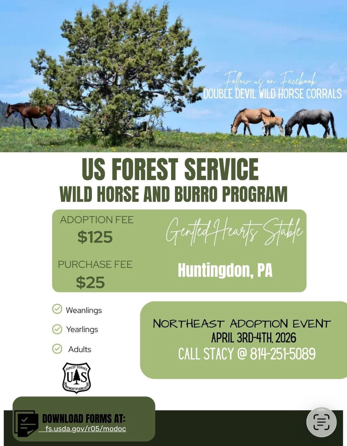 Save America's Living Legends! Adopt a wild horse or burro on April 3rd and 4th at Gentled Hearts Stable in Huntingdon, PA! Call Stacy at 814-251-5089 or visit Double Devil Wild Horse Corrals' Facebook page for more information!